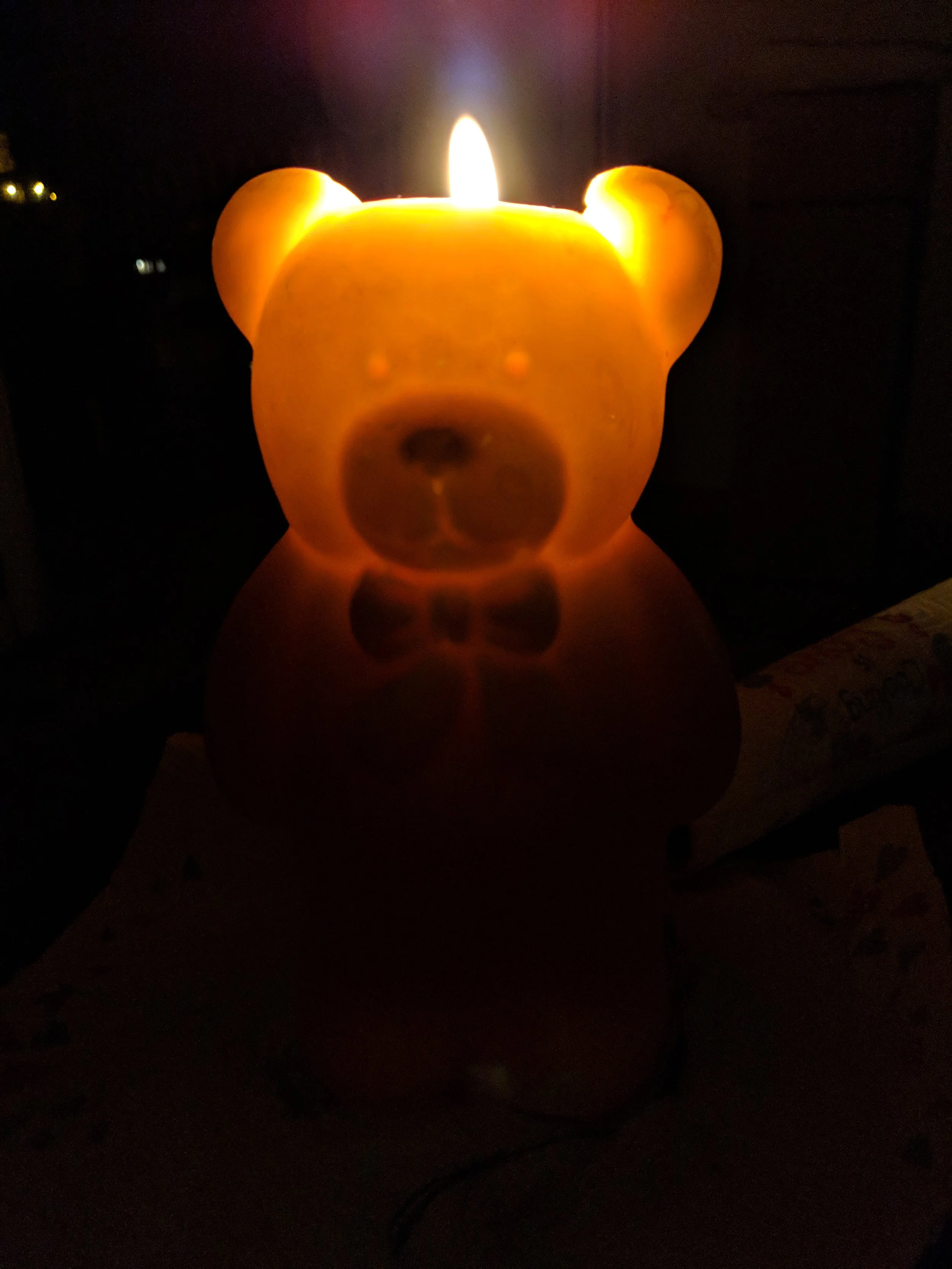 One of the funnier items we inherited from the previous owner was a bright yellow teddy bear candle. We spend every night by candlelight, preferring low light after years spent on concert stages, but this creepy bear was ... different. “Seeing his head on fire reminds me that I have a headache,” Zen said when we first lit it up, “and the color reminds me that I have to pee.” Nevertheless, when it started to get dark, it illuminated the house with a warm and beautiful light, making everything look cheery and homey. Until its face melted off and it collapsed on itself, that is.